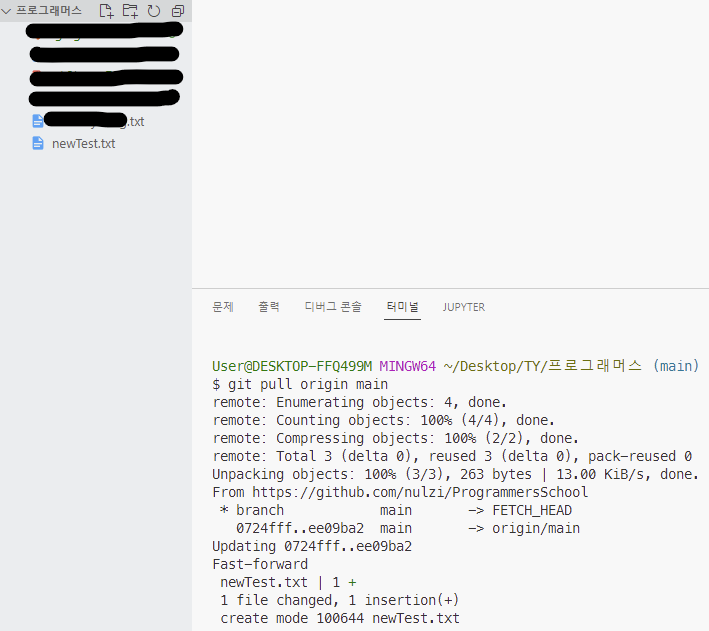 명령어가 제대로 동작하면서 새로운 변경사항인 'newTest.txt' 파일이 생긴 것을 확인할 수 있습니다.