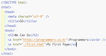 <h2> 태그로 제목을 적고, 다른 사이트나 페이지로 이동할 수 있는 <a> 태그를 활용한 실습입니다. 제목은 기본 글씨보다 크고 굵어지고, 링크가 생긴것을 확인할 수 있습니다. 링크의 경우 내가 만든 html로 이동하는 것도 가능하고 기존의 사이트로 이동하는 것 또한 가능합니다.