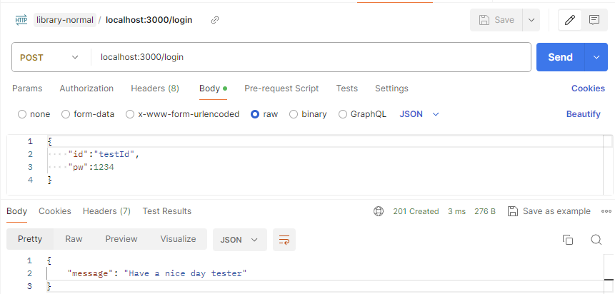 - 가입 : POST, '/signup', req: body{id,pw,name} res: 'success' →login page