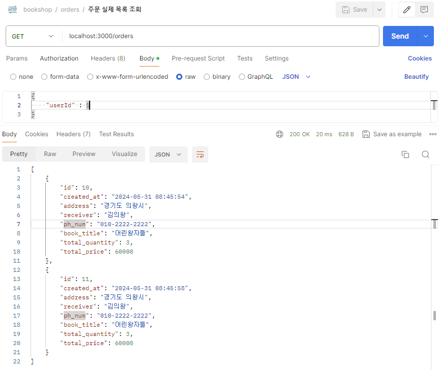 sql = `SELECT orders.id, created_at, address, receiver, ph_num, book_title, total_quantity, total_price