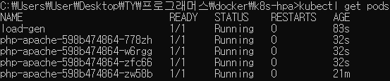 `kubectl run -it load-gen --rm --image=busybox --restart=Never -- /bin/sh -c "while sleep 0.01; do wget -q -O- http://php-apache; done"` 명령어를 통해 부하를 줄 수 있습니다. 부하의 변경은 `kubectl get hpa php-apache --watch` 명령어를 통해 확인할 수 있습니다. 시간이 지나 부하가 커지면 포드의 수가 늘어나고, 부하를 줄이면 늘어났던 포드의 수가 다시 줄어드는 것을 볼 수 있습니다.