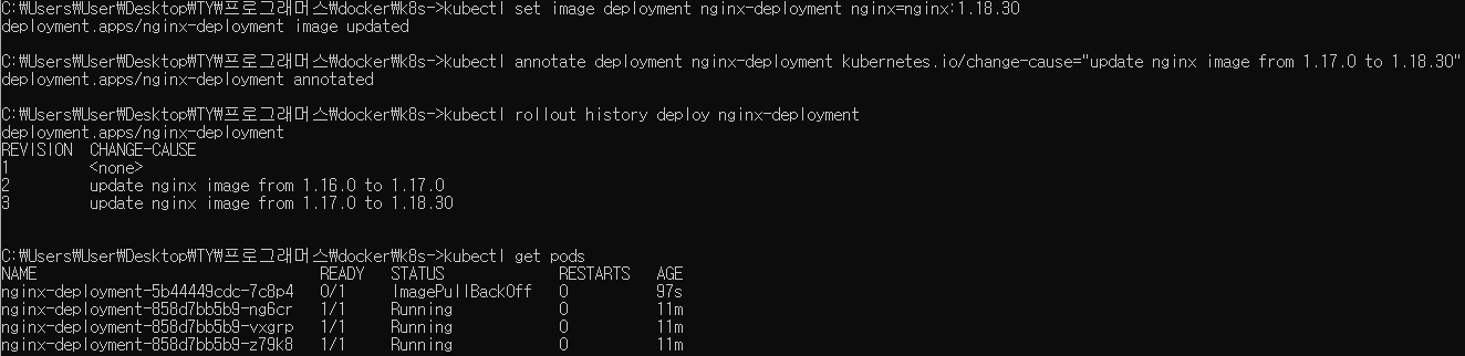 업데이트한 버전을 annotate를 이용해 기록을 남겨보겠습니다. `kubectl annotate deployment nginx-deployment kubernetes.io/change-cause="<메시지>"`