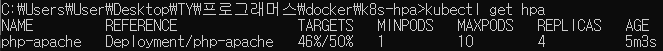 https://k8s.io/examples/application/php-apache.yaml로 제공되는 파일을 apply 시켜서 웹 서버를 배포하고 HPA를 사용해 cpu 사용율 50%를 기준으로 동적으로 스케일링시켜 보겠습니다.