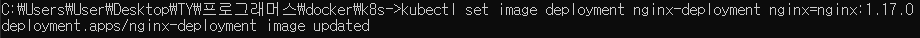 현재는 1.16.0 버전인 것을 확인할 수 있습니다. 이제 버전을 업데이트해 주겠습니다. `kubectl set image deployment nginx-deployment nginx=nginx:1.17.0` 명령어를 사용합니다.