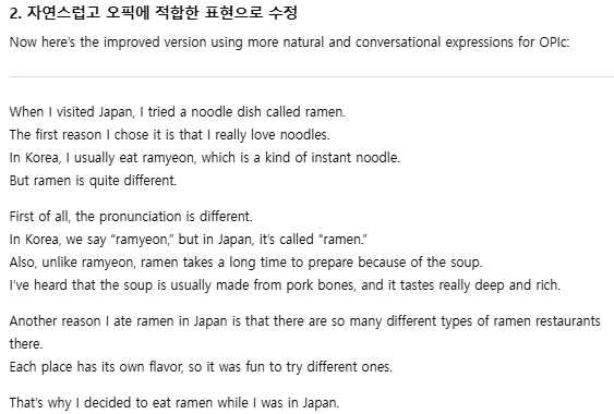 저는 처음 시험을 도전해 보는 것이고, 영어 말하기가 아직 부족하기 때문에 너무 자연스럽게 답변을 고쳐달라고 요청하지 않았습니다. 개인의 레벨에 맞게 요청하는 것이 좋다고 생각합니다.