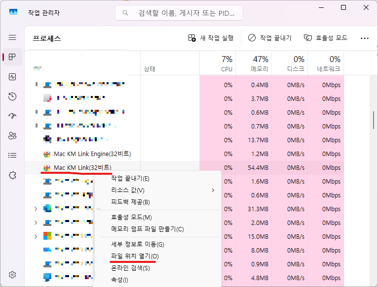 작업관리자에서 원하는 프로그램을 찾아서 우클릭하면 파일 위치 열기를 통해 해당 exe 프로그램이 어디에 있는지 찾을 수 있습니다.